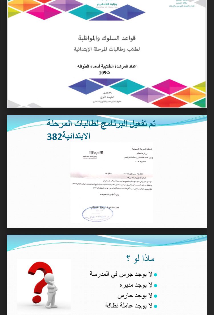 التوجيه والإرشاد On Twitter قواعد السلوك والمواظبة للمرحلة الابتدائية ت طبق على مرحلتين المرحلة الأولى شرح آليات الدليل التنظيمي والإجرائي المرحلة الثانية عقد دورات في المدارس