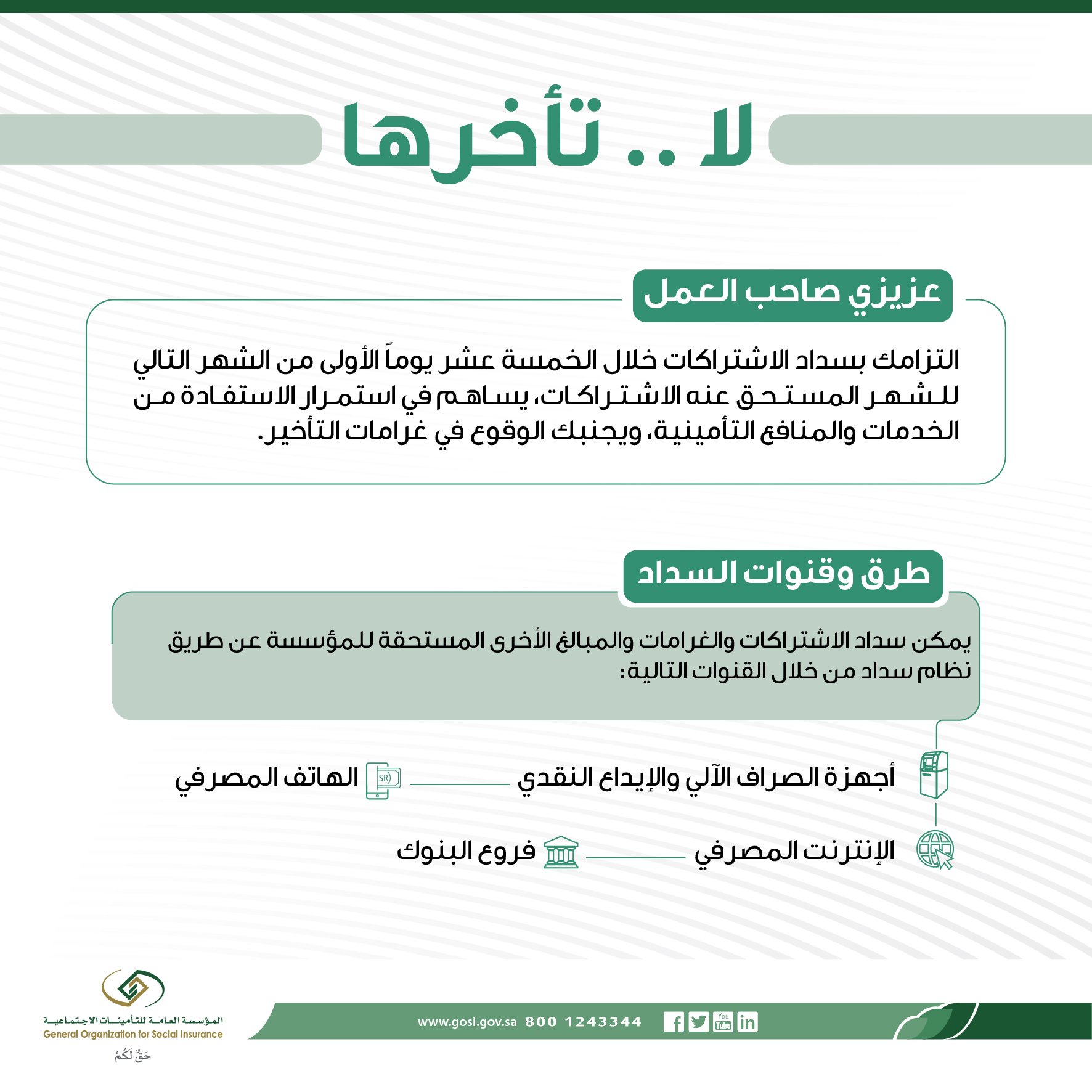 التأمينات الاجتماعية On Twitter عزيزي صاحب العمل التزامك بسداد الاشتراكات في الوقت المحدد يساهم في الاستفادة من الخدمات والمنافع التأمينية ويجنبك الوقوع في غرامات التأخير التأمينات الاجتماعية Https T Co Aq6sjrovxl