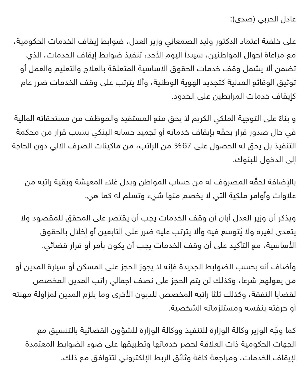 العدل تلغي إيقاف الخدمات إلا في حالات محدودة المدينة