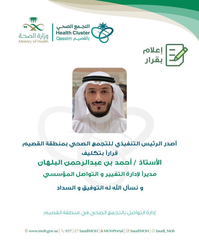 مـ نـ سـ و بـ ي و ز ا ر ة ا لـ صـ حـ ـة Auf Twitter قرار أصدر الرئيس التنفيذي للتجمع الصحي بالقصيم قرارا يقضي بتكليف الأستاذ احمد البلهان