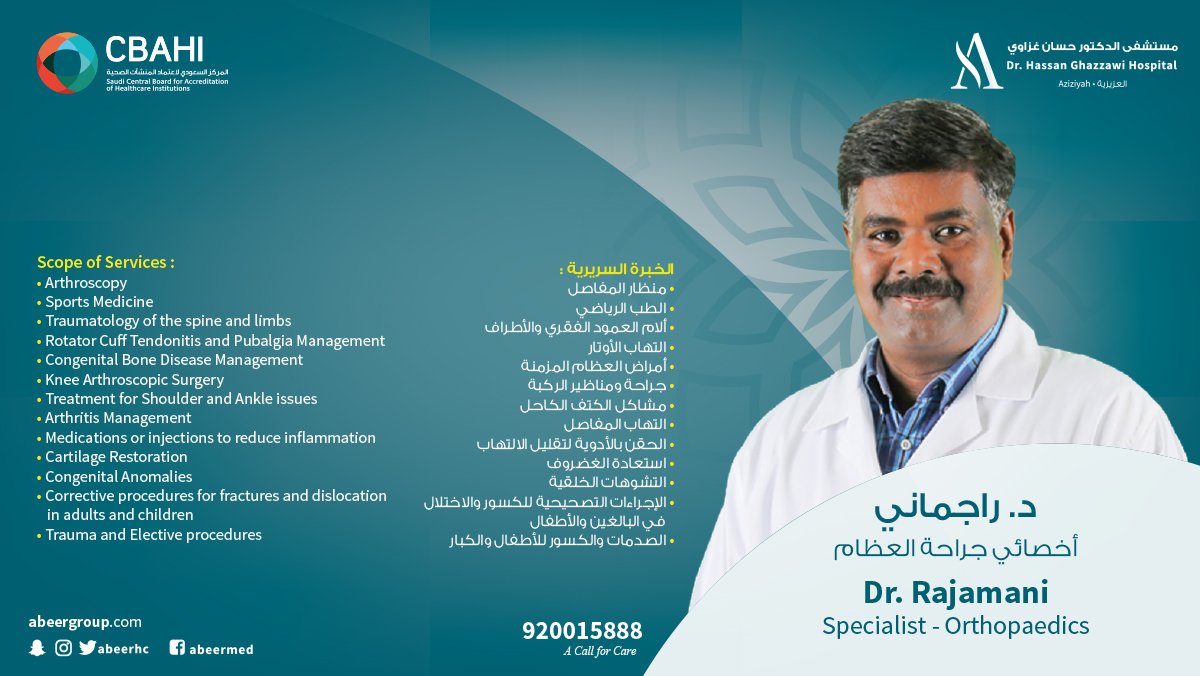 Abeer Medical Group Ksa Na Twitteri د راجماني أخصائي جراحة العظام مستشفى الدكتور حسان غزاوي ولمزيد من الإستفسار يمكنك دائم ا الوصول إلينا على الرقم 920015888 Dr Rajamani Specialist Orthopaedics At Dr Hassan